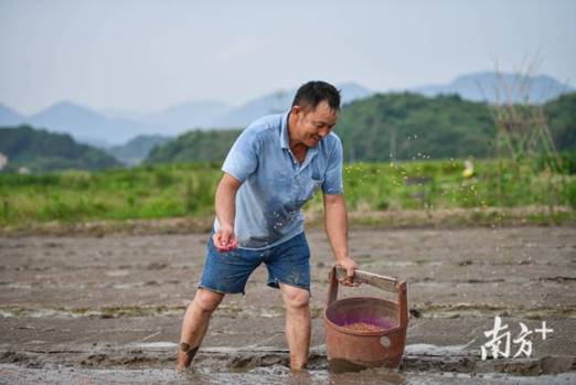 时值初夏。清远连州市丰阳镇朱岗村,村民吴战辉一手提着胶桶,一手抓起一把稻种撒在秧盘上,在田里忙活起来。
